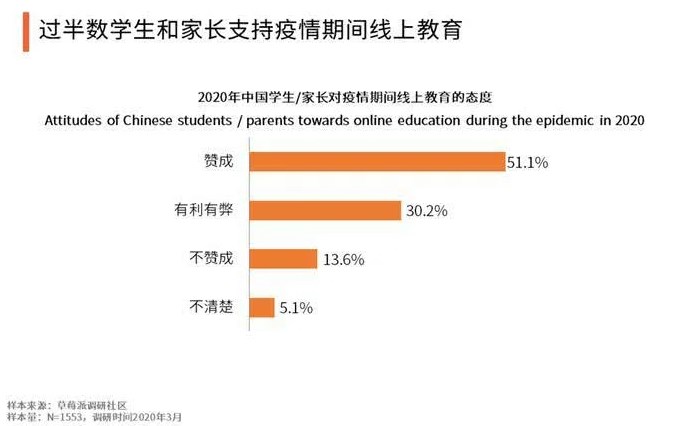 其中,近一半的家長和學(xué)生對(duì)疫情期間線上教育持贊成態(tài)度。