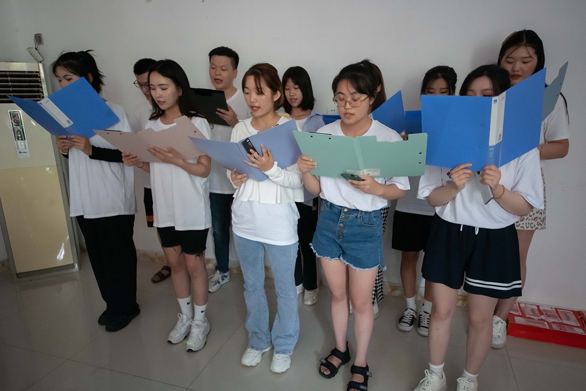 會議第一項:員工士氣展示。各個部門的員工上臺喊出本部門的口號,展現(xiàn)出高昂的士氣,最后由田總評選出最優(yōu)秀的團(tuán)隊。